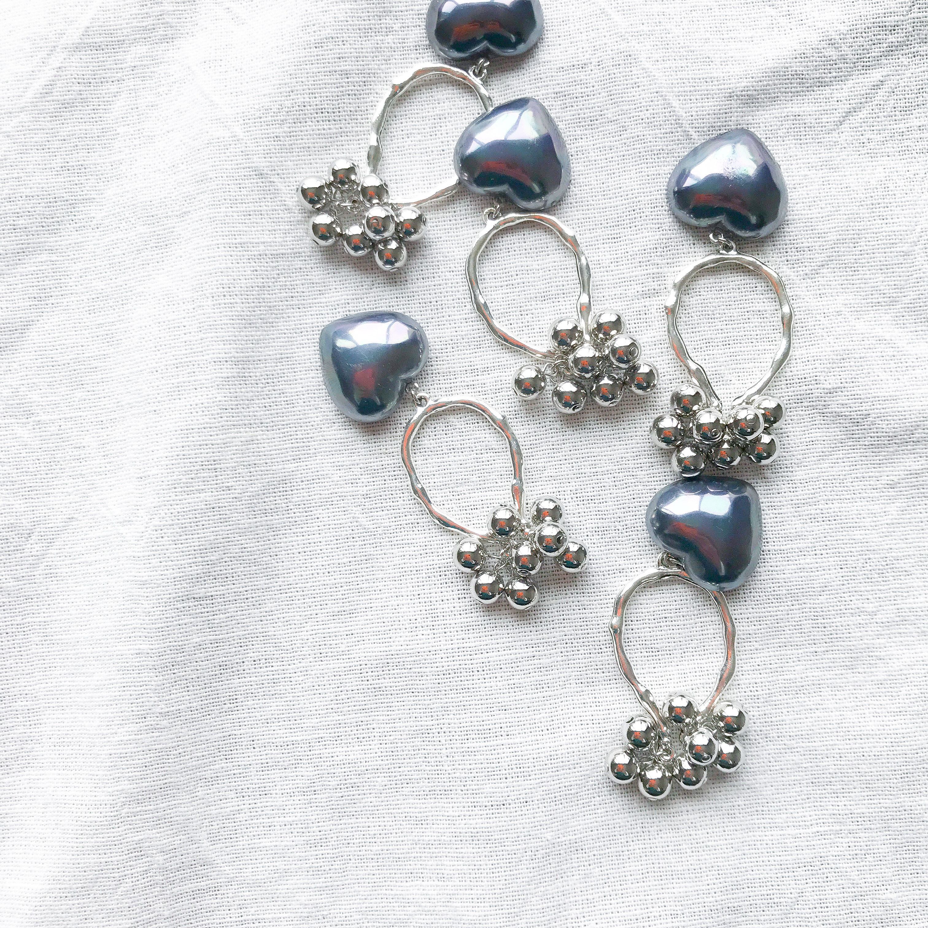 ブルーグレーなハートとシルバーパーツを組み合わせたピアス。