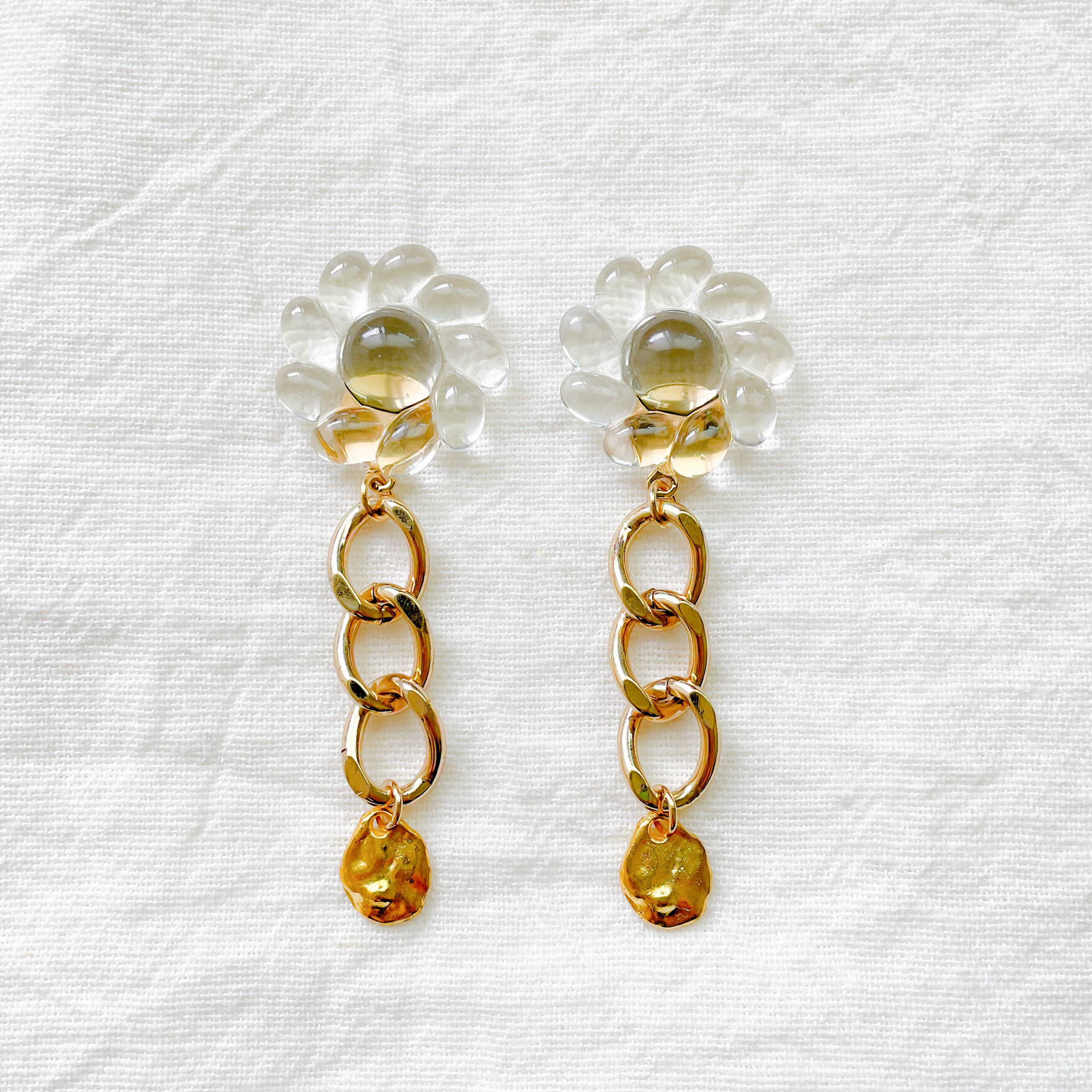 クリアなフラワーカボションとゴールドチェーンの組み合わせが抜群の